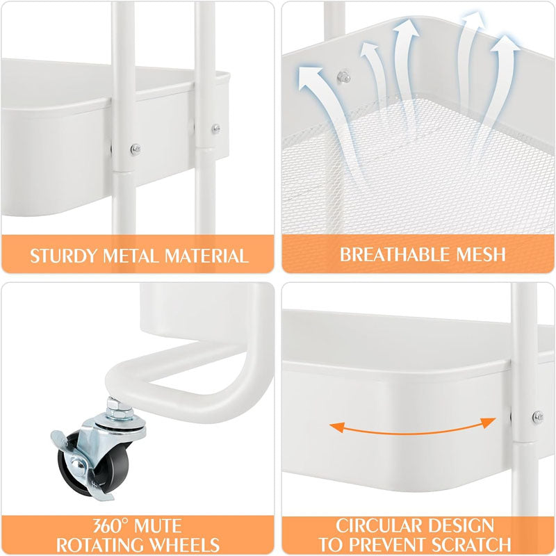 【HIGH MESH GUARDRAIL Design】The rolling cart features a high mesh design, providing added height to prevent items from falling off. This utility cart ensures secure storage for all your items.