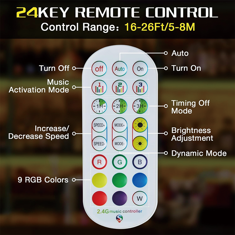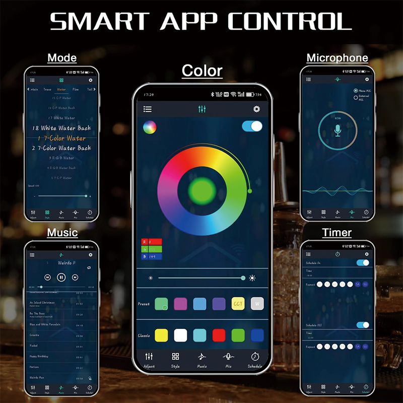 Our liquor bottle shelf is equipped with a 24 key remote control, which can work and perform various settings within a range of 25 feet. Take full control of your space with adjustable brightness, dynamic colors, and hundreds of modes, its flexible controls empower you to create the perfect atmosphere for any mood or occasion.
