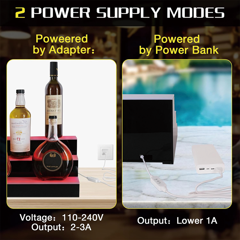 Compared with the ones supplied by fixed voltage, our LED liquor bottle display shelf is adaptable with wide voltage, ranging from 100V to 240V. With its advantages, the wide-range voltage can secure the stable power supply for reliable operation, whether it is the peak of urban power consumption or the shortage of power supply in remote areas.