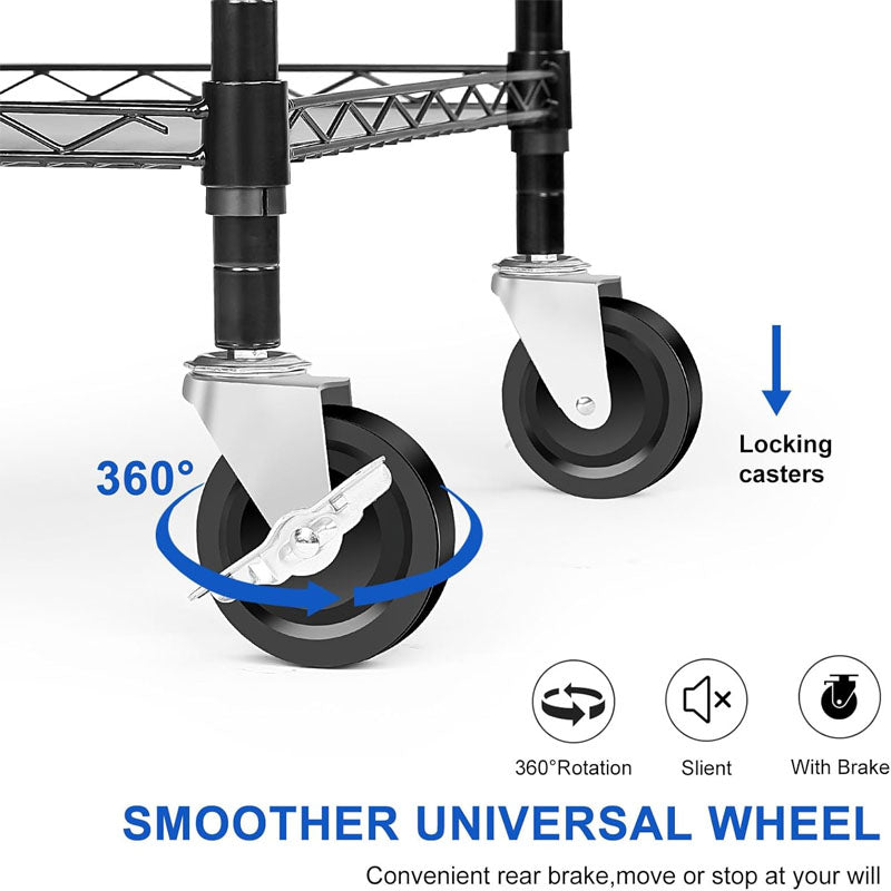 【With Silent Wheels&Hanging Hooks】4 Non-noise wheels,with 2 locking brakes for safety,durable and long-lasting in everyday usage. Packaged with 8pcs S metal hooks, which can effectively use the shelf space to hang kitchen supplies or other daily necessities. 3 extra PP shelf liners are included, which is convenient for you to clean this 3 tier work cart.
