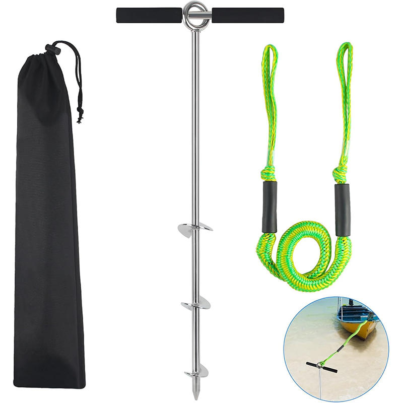Sand anchors come with a bungee tether, which is easy to screw into the sand, and at the same time, it creates a strong grip to stabilize your boat, which prevents the boat from crashing/drifting away when you take a short break near the shore.