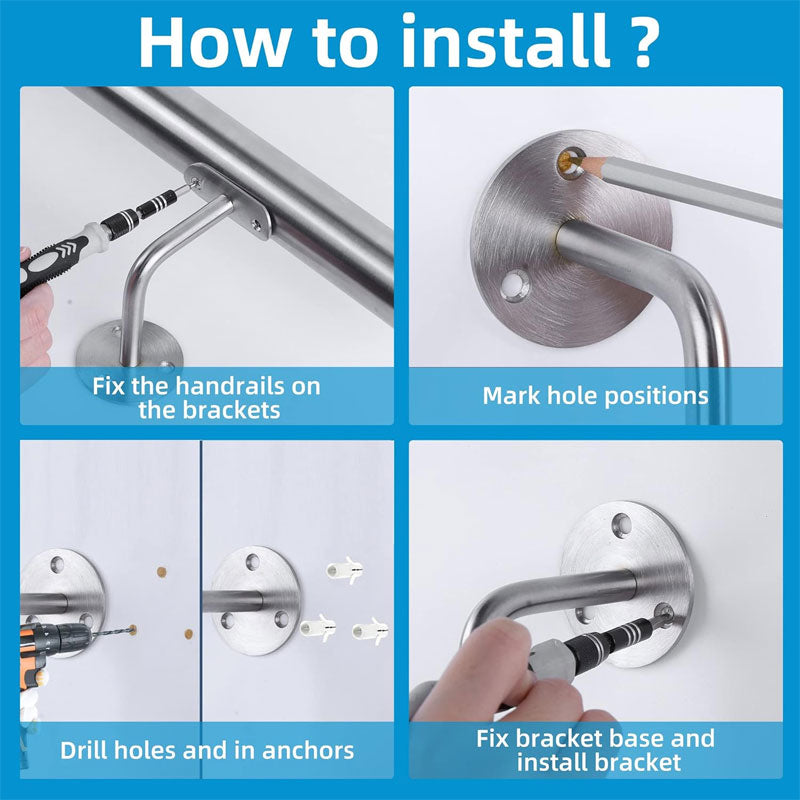3. The step railing comes with complete accessories for easy installation, including 1 handrail tube, 2 brackets, 4 bracket screws, 6 wall screws and 6 anchors.
