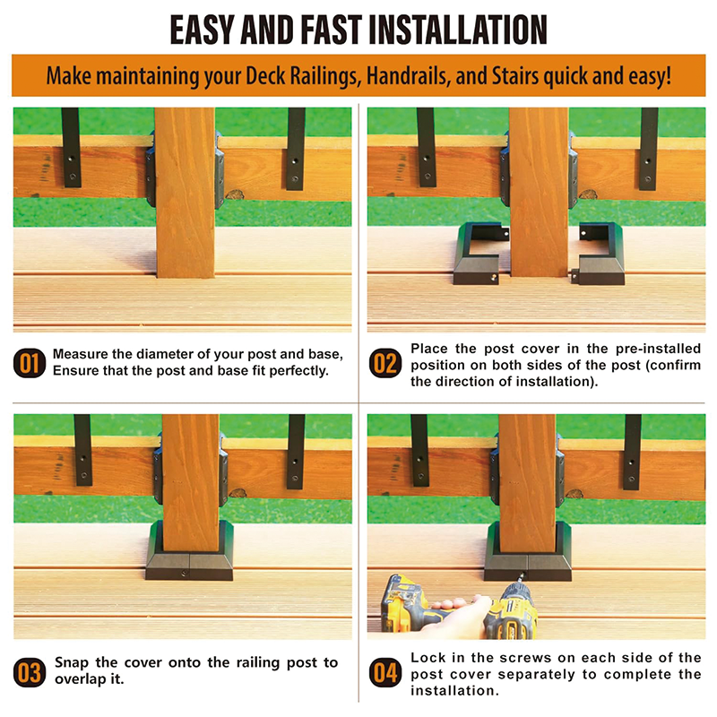 Deck Post Covers are split design, no need to pull out the railing, Easily cover unsightly exposed post anchors or construction defects without incurring costly repairs. Present a uniform and simple beautiful visual effect for your indoor and outdoor deck railings, handrails, stairs and porches.