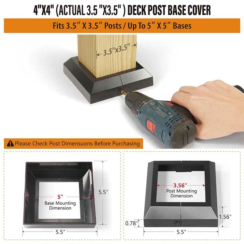 Suitable for Post size 4 "x4" (Actual: 3.5 "x3.5") Post, Base size 4.4"x4.4", Height size 1.56". QTY: 4pcs