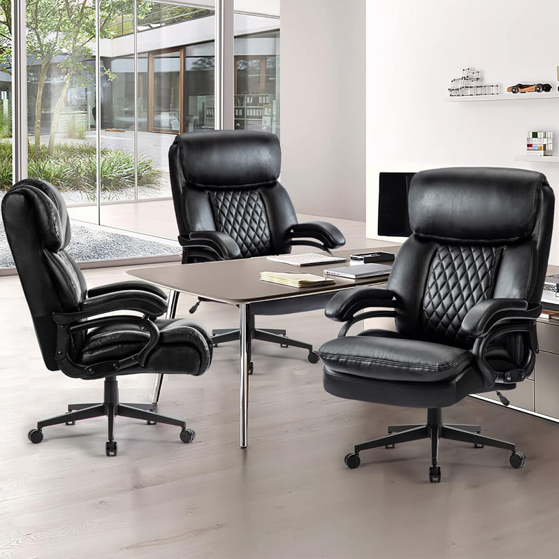This adjustable executive office chair boasts an included headrest and generous padding in the high back, seat, and arms to cradle you in comfort.