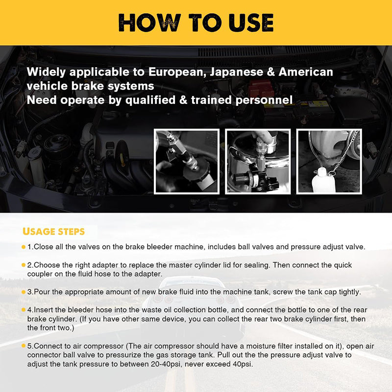 With our pressure brake bleeder, you can maintain a steady pressure while bleeding your brakes,
