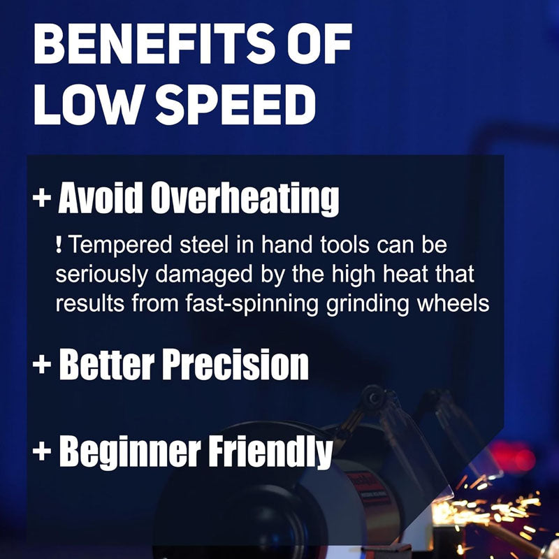 LOW-SPEED: Slow speed bench grinder equipped 1/3HP motor, provides 1750RPM speed, more suitable for accurate grinding operations, making your work more precise