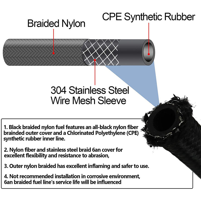 Made of durable CPE synthetic rubber tube bonded and secured by Nylon and 308 Stainless Steel outer braid