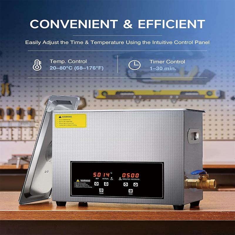 Fill the tank with water and any needful cleanser, place your items in the basket, set the temp between 20 and 80°C (68 and 176°F) and the timer from 1 to 30 minutes on the intuitive digital control panel, and press the power button; this portable ultrasonic cleaner's 40kHz cavitation will start, and your object will be clean in minutes.