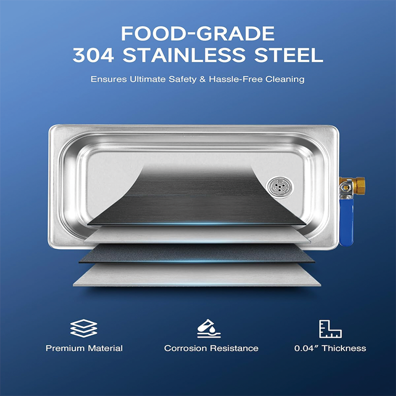 This ultrasonic washing machine uses 304 stainless steel for the inner basket and tank to withstand years of continual use with or without cleaning solutions; non-skid rubber feet anchor it safely during use while inset handles keep it easy to carry from place to place; and two built-in fuses protect against power surges for even greater longevity.