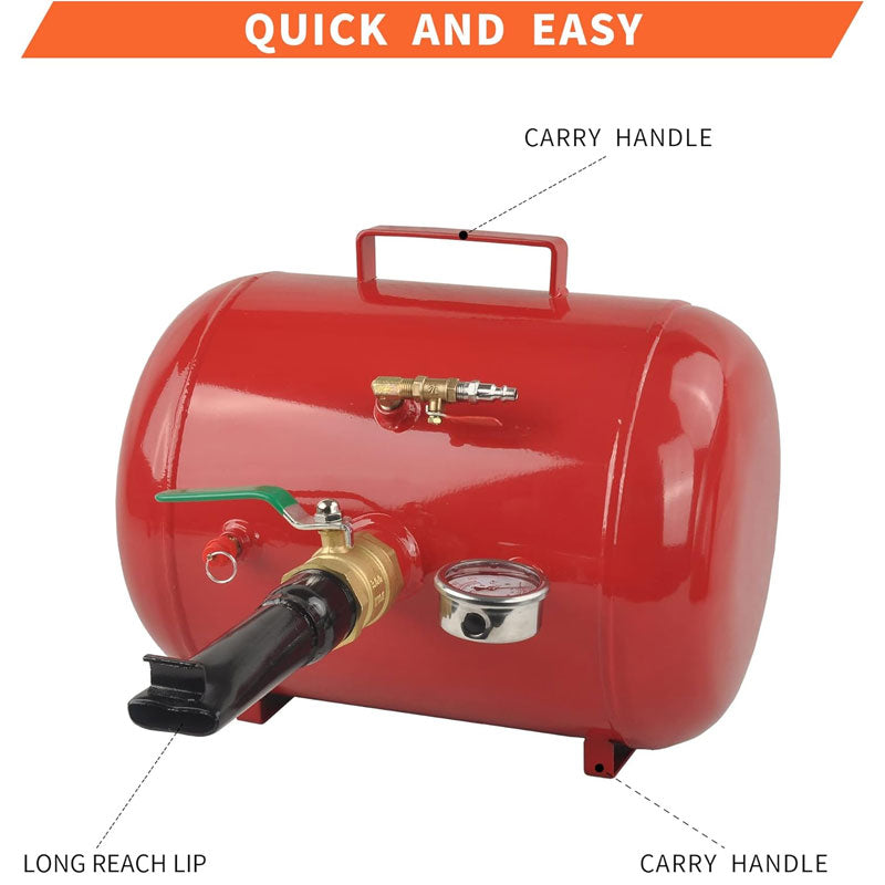 Use the included easy-to-read gauge to accurately fill the tank at the recommended 87-116 PSI working pressure from a standard shop compressor.