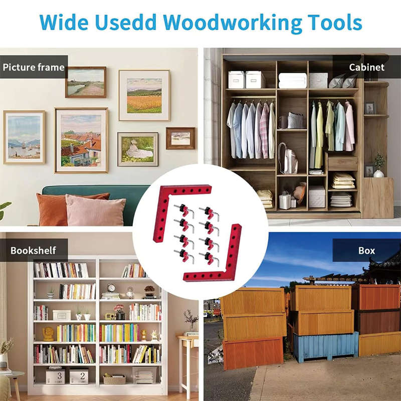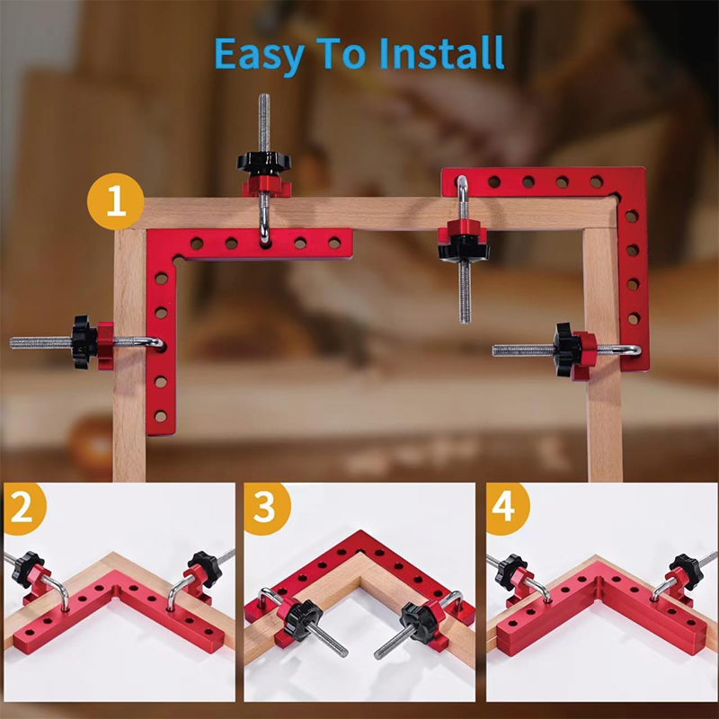 wood clamps for woodworking just 2 steps to install. 1. Placing the positioning square corner clamps on the corners of the wood product, 2. Fixing it with a set of clips.