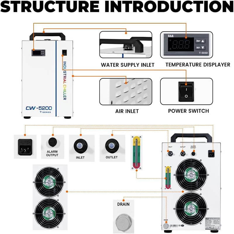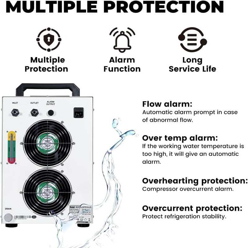 【Precise Temperature Control】 Industrial water coolers have dual mode temperature control (automatic and intelligent),It can keeps the temperature constant within 0.3°C;Constant & Intelligent temperature mode; Automatically adjust the temperature according to the indoor environment temperature; Manual setting range is 5-45°C.