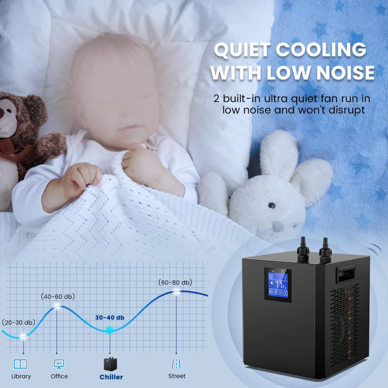 Low Noise Water Chiller Cooling System - The hydroponic aquarium water chiller for fish tank works in a low noise cycle to provide you with a quiet living environment. Hydroponic aquarium chiller with three modes can adjust the temperature, temperature difference and timing, which has touch screen to operate with detailed instruction, so that you have a full understanding of the fish tank cooler, quickly learn to use.