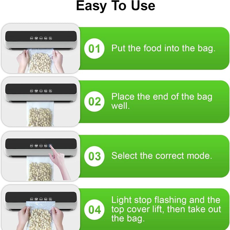 【5 Versatile Modes】Our vacuum sealer machine boasts 5 sealing modes: SEAL, EXTER VAC, Manual, Moist Vac Seal, and Dry Vac Seal. Simply place your bag into the food vacuum sealer, select the appropriate mode, and it will initiate the vacuum and sealing process automatically.