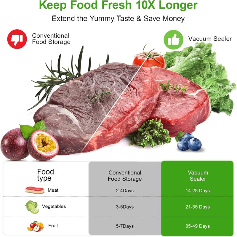 【Keep Fresh and Save Money】The powerful suction power of 70kpa of our vacuum sealer machine can suck the air more tightly, allowing you to vacuum seal various foods more easily and quickly, helping to save money and time.