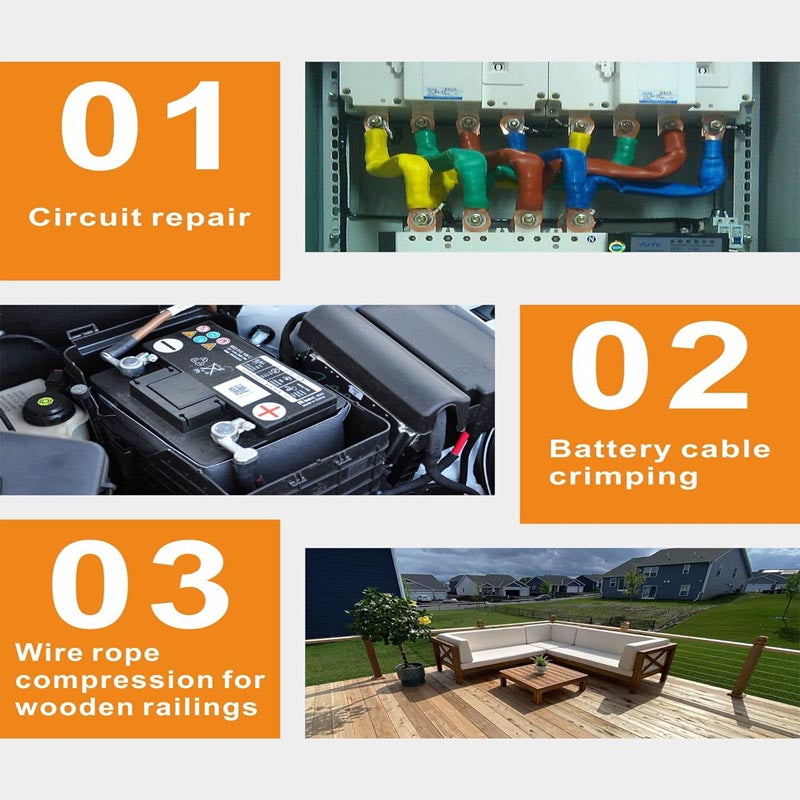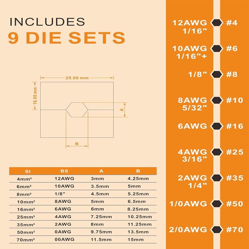【Versatile Die Selection】Includes 9 pairs of dies (12, 10, 8, 6, 4, 2, 1/0, 2/0 AWG, and 1/8" for stainless steel wire rope) to cover all your needs, from battery and welding cables to power and electrical cables, providing the flexibility to tackle any job.