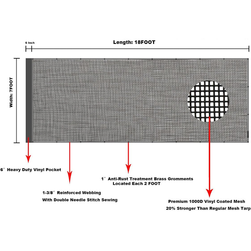 Dump Truck Mesh Tarp 7' × 18' Black Heavy Duty Cover with 6'' Pocket Double Needle Stitch Webbing