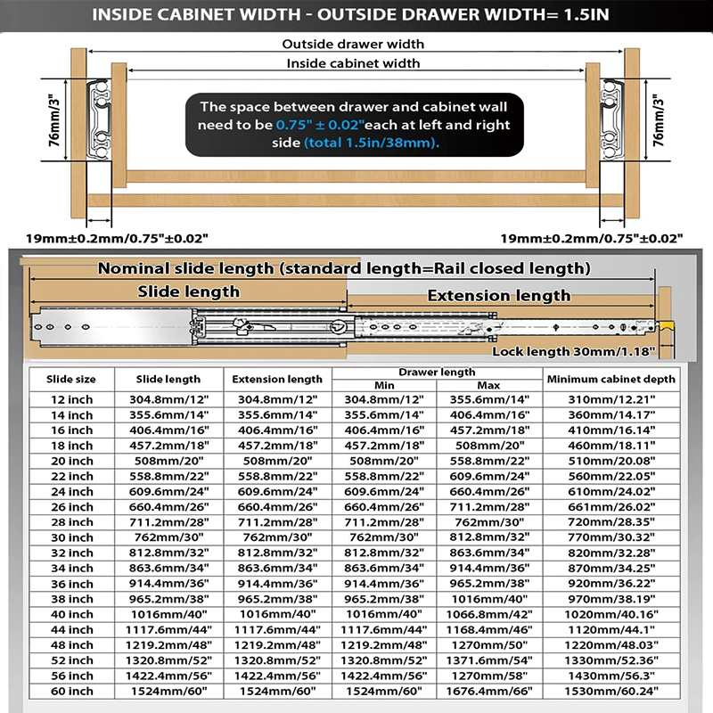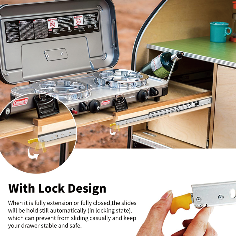 Our cold-rolled steel draw slides achieve high hardness, durability, and stability.Install your drawers at in cabinet warehouse containers, industrial drawers, commercial equipment, retrofitted vehicles, and get ready to slide, lock, and close. Stability and durability are achieved for a high-quality performance you can trust.