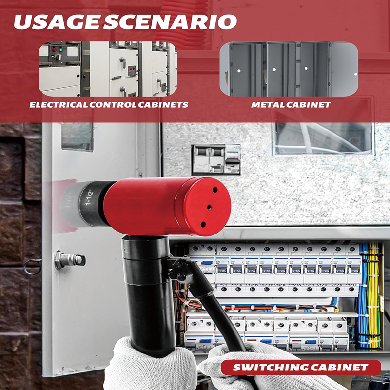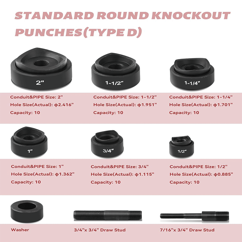 Complete Punch Tools]: Hydraulic punch tool kit features 1pc 80 KN pump, 2pcs draw studs, 1 set of spacers and 6 sets of interchangeable dies & punches for conduit fitting size of 1/2", 3/4", 1", 1 1/4", 1 1/2" and 2", can drill different sizes holes on stainless steel, aluminum, steel, plastic, etc; 1/8” (11 gauge) max punching thickness for steel and 1/16” (14 gauge) for stainless steel, good to be used for different drilling projects.