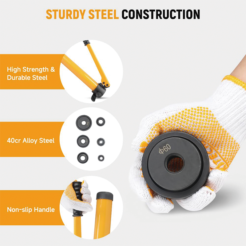 Built with durability in mind, the kit features a robust hand pump and a high-pressure hose (0.8 meter) to withstand heavy-duty use. The punches and dies are crafted from high-quality materials, ensuring long-lasting performance and reliability.