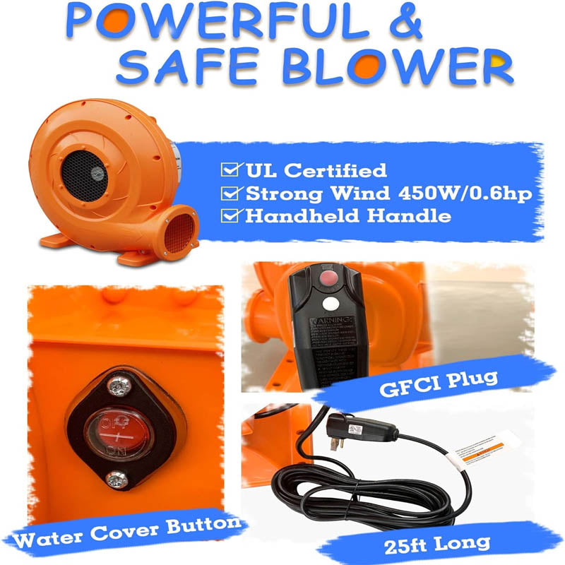 Safe for Kids: Our bounce house includes heavy duty air blower. The jumping area is surrounded by 3 sides of mesh safety netting to protect your children from falling while jumping. Air leak from all the seams is necessary because the product is inflated by constant air flow and this leakage is required to stop the product becoming over-inflated.