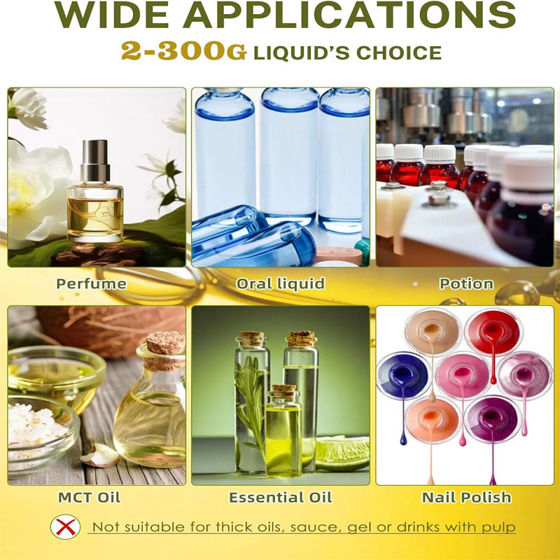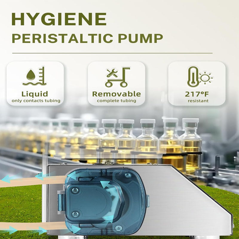 Hygienic Peristaltic Pump: Compared to other pumps, peristaltic pump has a biggest advantage that liquid only contacts the silicone tube so that there is no pollution while filling bottles.And this liquid filling machine is also equipped with a large 40oz/min peristaltic pump that it can handle a 300g bottle within 15s.