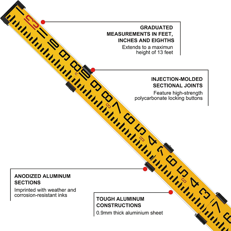 The leveling rod constructed with 0.9mm thick aluminum alloy, durable aluminum construction holds up in tough environments.