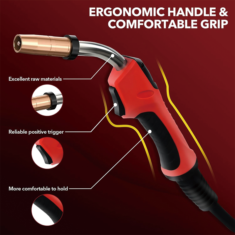 The welding torch features a curved handle, allowing you to experience unparalleled comfort during the welding process; the easy-to-use trigger mechanism ensures easy control and very positive response, ensuring a reliable and efficient welding experience.