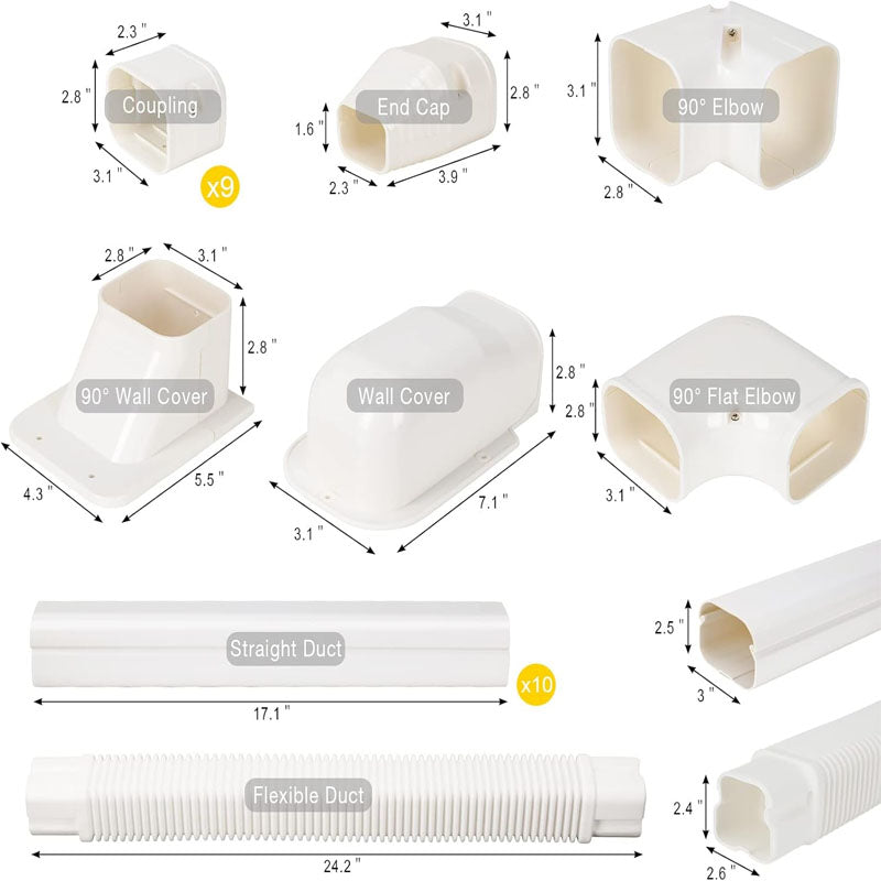 Package includes: We provide a complete AC line cover kit with all the necessary accessories. 10 x 1.41 ft straight ducts, 1 x 2 ft flexible duct, 1 x wall cover, 1 x 90° wall cover, 1 x 90° flat elbow, 1 x end Cap, 1 x 90° elbow, 9 x coupling.