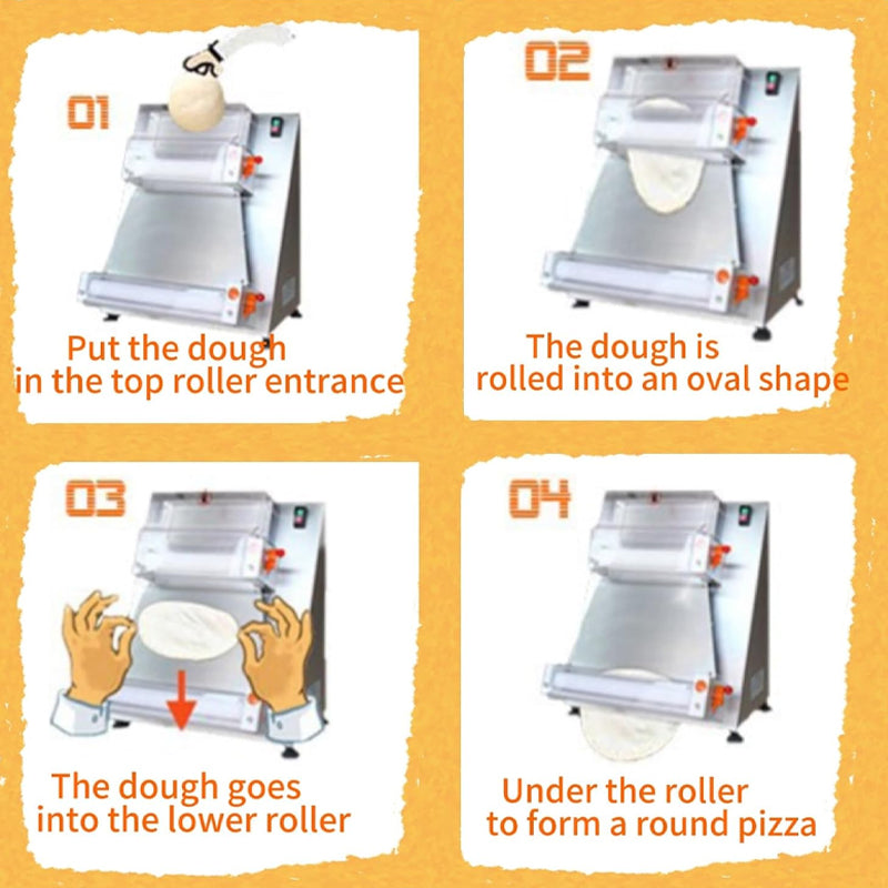 Dough roller machine is equipped with an 11.81-inch upper roller and a 16.53-inch lower roller.