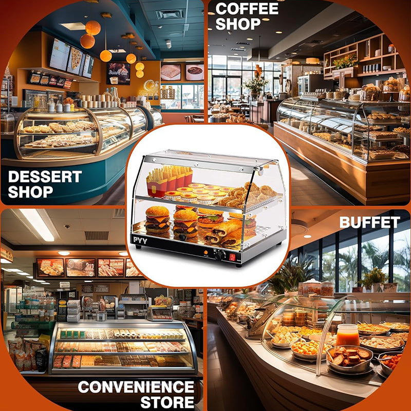 Acrylic sheets of the commercial food warmer clearly show the food inside.