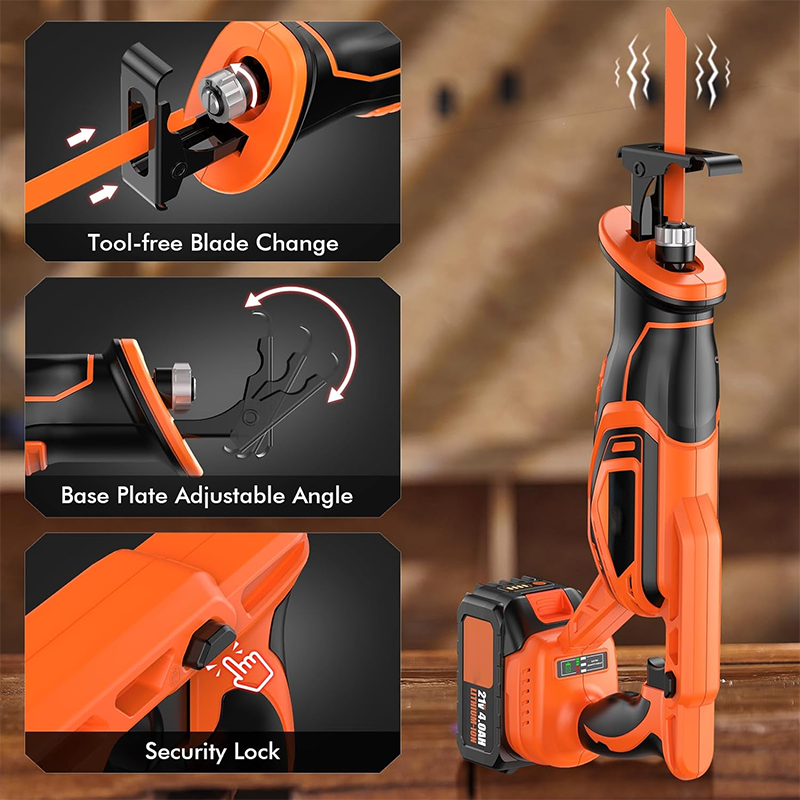 saw safety lock design prevents accidental activation. The reciprocating saw's lanyard design makes it easy to carry for
