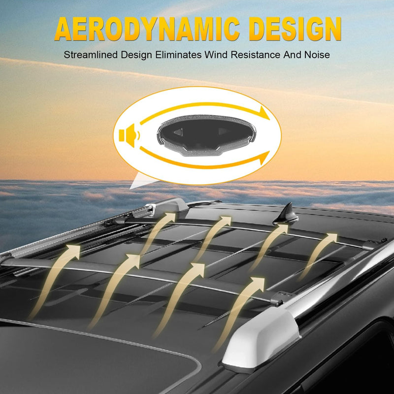 Sleek, aerodynamic design applied to roof cross bars to the wind noise or vibration even at highway speeds and will not impede normal skylight opening.
