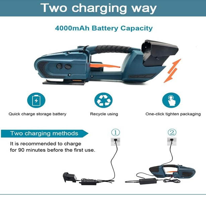 【2x4000 Rechargeable Lithium battery】 The Electric strapping can work anywhere ,anytime when fully charged.The automatic plastic banding machine contains 2 *4000 mAh Rechargeable lithium battery, each can be recharged 2000 times. Only charge for 90 minutes, then it can work outdoors for 4 hours, and pack about 100-240 belts.