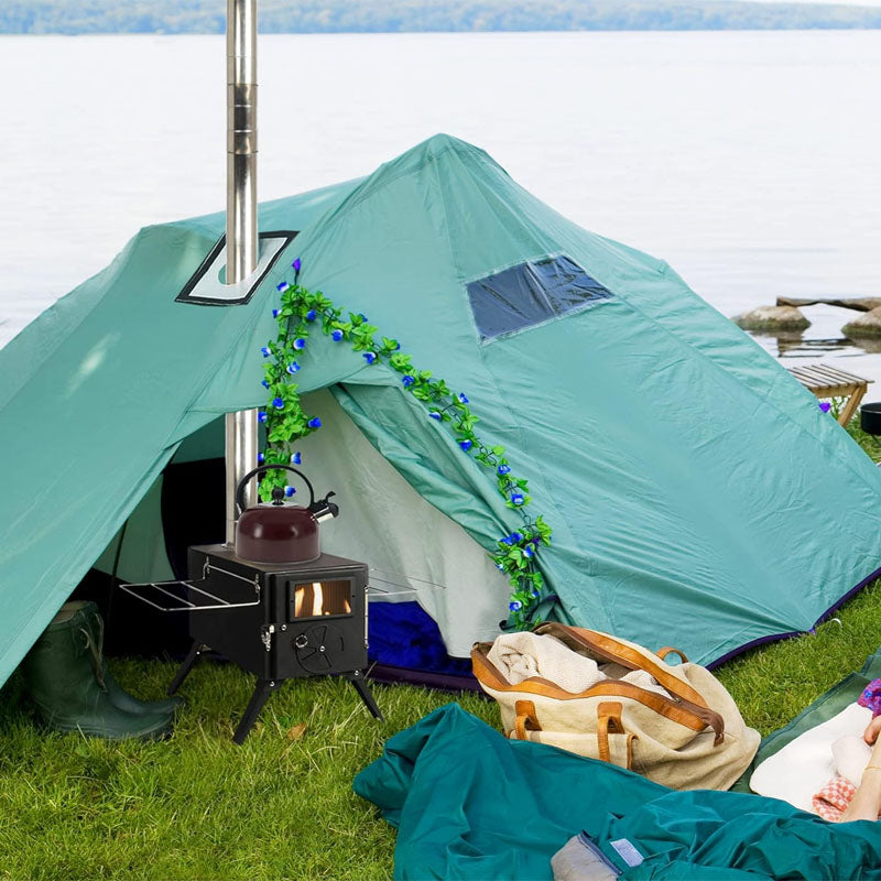 【Portable Tent Stove】The folding racks on both sides increase the functionality of easy portability.The side frame can be used as a portable. The chimney tube can be easily stored in the furnace for easy transportation and storage. The hook that comes with the wood stove makes it easy to clean the ashes at the bottom.