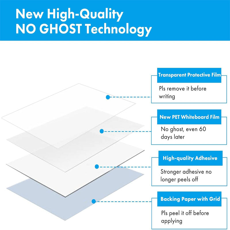 SUPER EASY to APPLY – You just need to peel and stick, the grid's design on the protective backing paper makes cutting easier.The product has been upgraded and is currently a high-quality whiteboard. Even if leave drawings on it for a month, they still erase with ease.